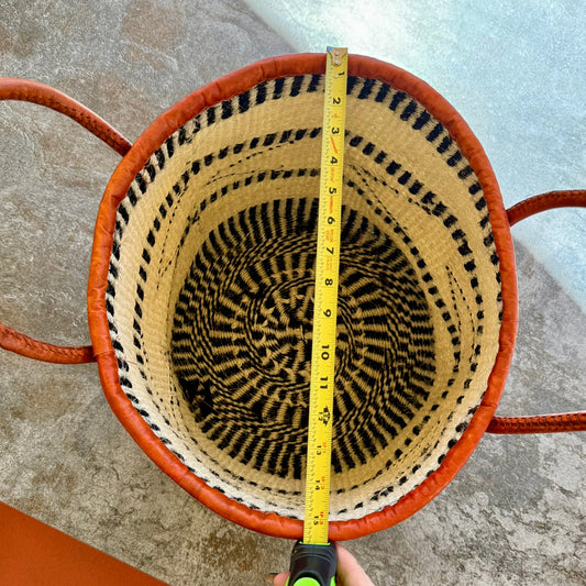 Kitui Basket - Large Open w/ Leather Trim & Handles (Ecru & Sienna Base Woven and Top Striped)