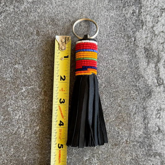 Handcrafted Maasai Beaded Leather Keychain (B&W Gold Striped w/ Silver Ring)