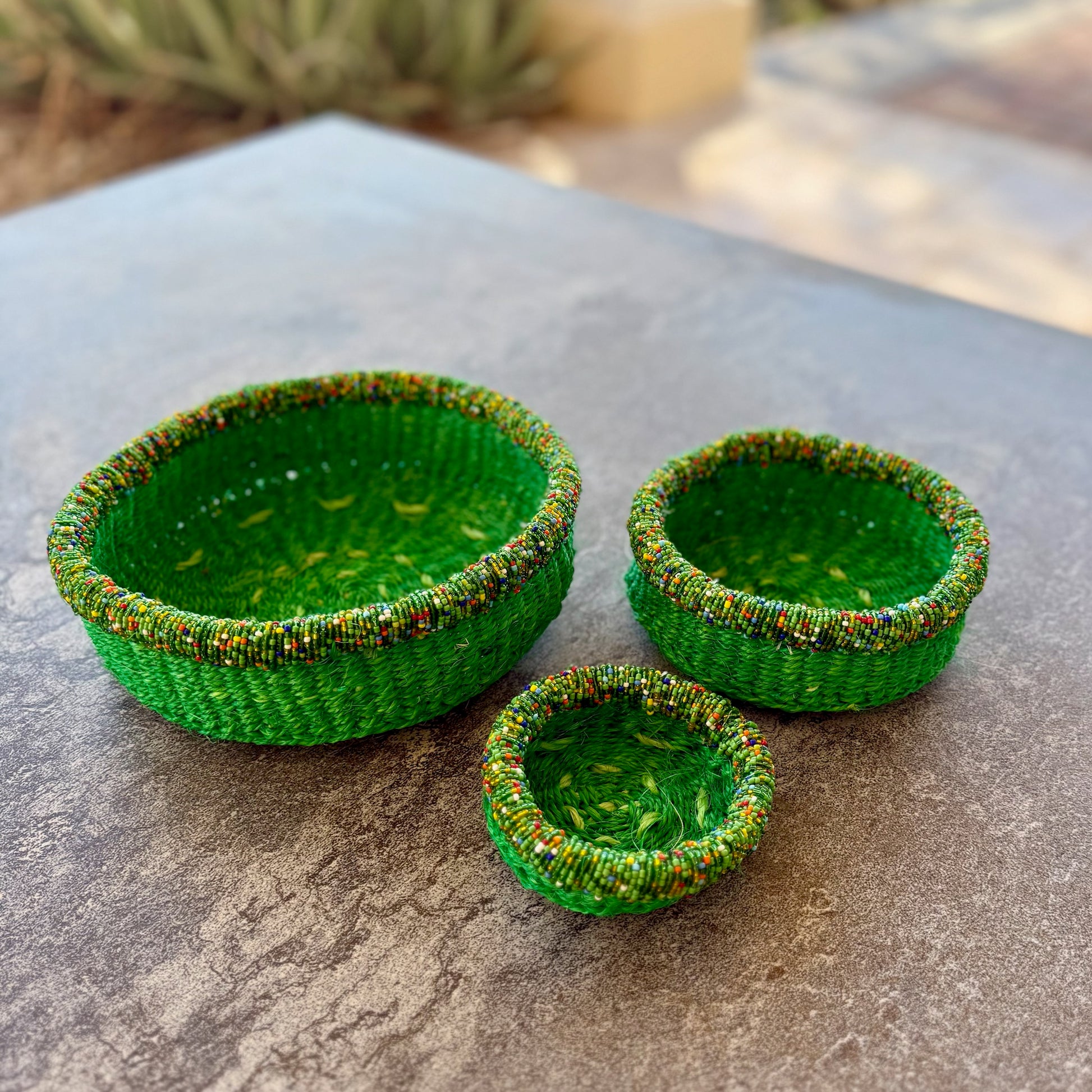 3-Piece Kitui Basket Set (Leaf Green & Beaded Multicolor Trim)