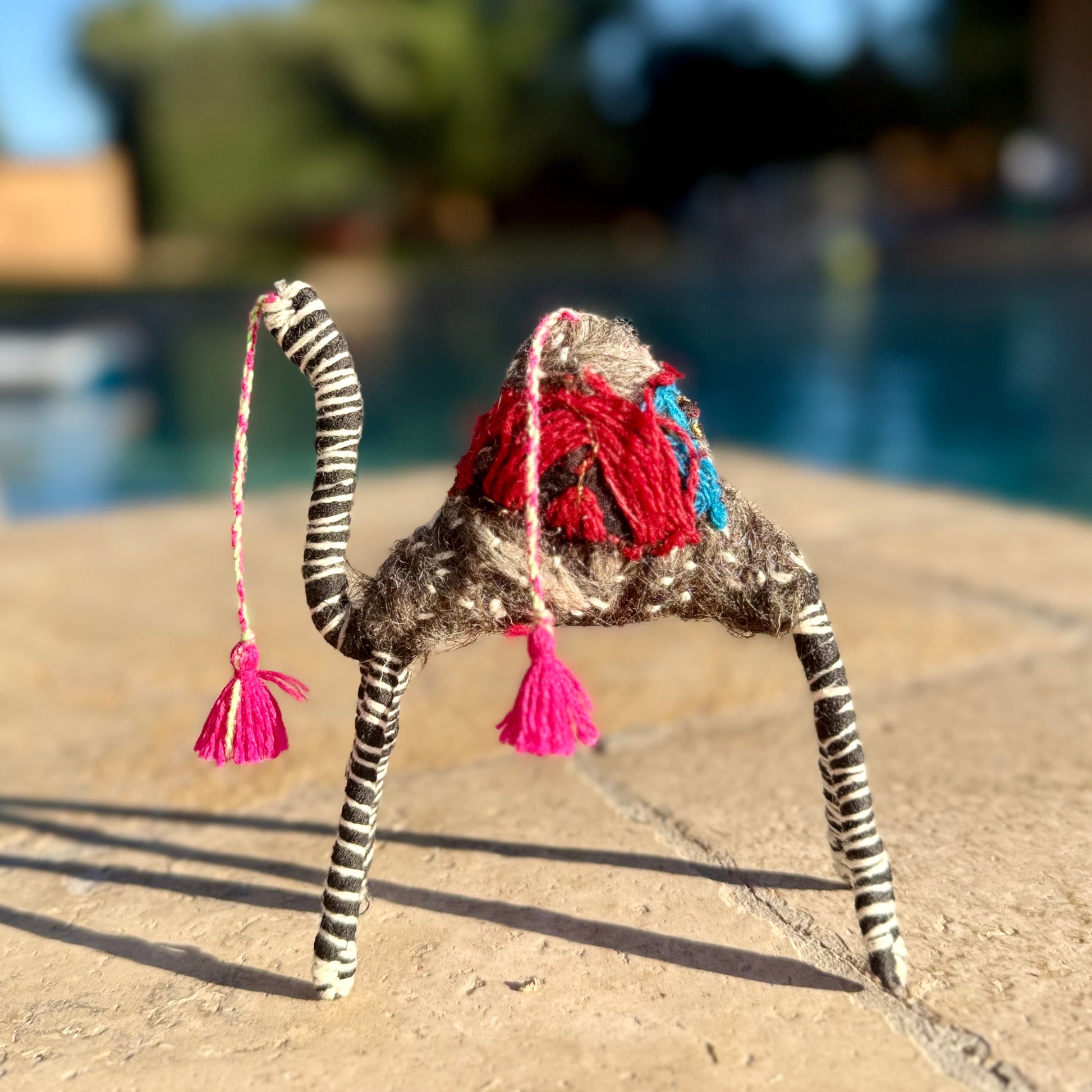 Atlas features rich desert tones, bold red and blue woven accents, bright pink tassels, and striking hand-wrapped legs with zebra-like striping. His strong posture and vibrant detailing give him a powerful, adventurous spirit, a true wanderer of the Sahara. These camels are more than décor, they’re symbols of resilience, artistry, and the beauty of reimagining found materials into something joyful and full of life.