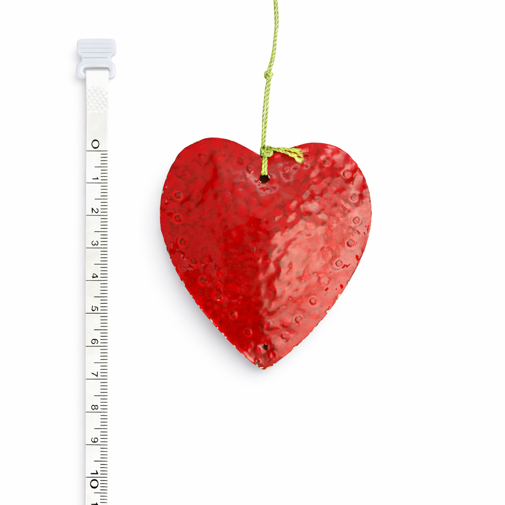 This charming heart hanging features four flat, textured red hearts suspended vertically on a bright green cord. Each heart has a gently hammered surface that catches the light beautifully, giving it warmth, depth, and an artisanal feel. Lightweight yet eye-catching, this piece adds a playful pop of color and love-forward charm to any space.