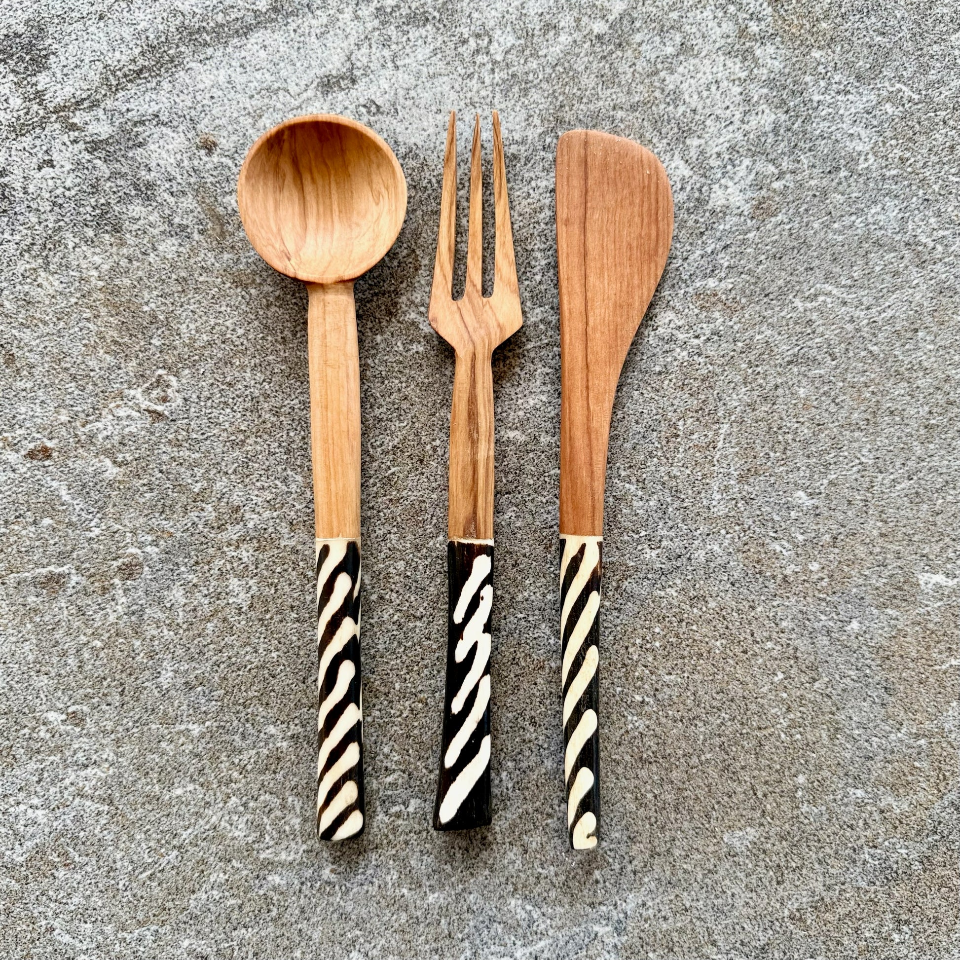 Hand-carved in Kenya from rich, warm rosewood, this artisan spreader features a striking bone-inlay handle crafted using traditional East African techniques. Each piece is shaped, sanded, and polished by hand before artisans set the patterned inlay into the handle, creating bold black-and-ivory designs that make every spreader completely unique.