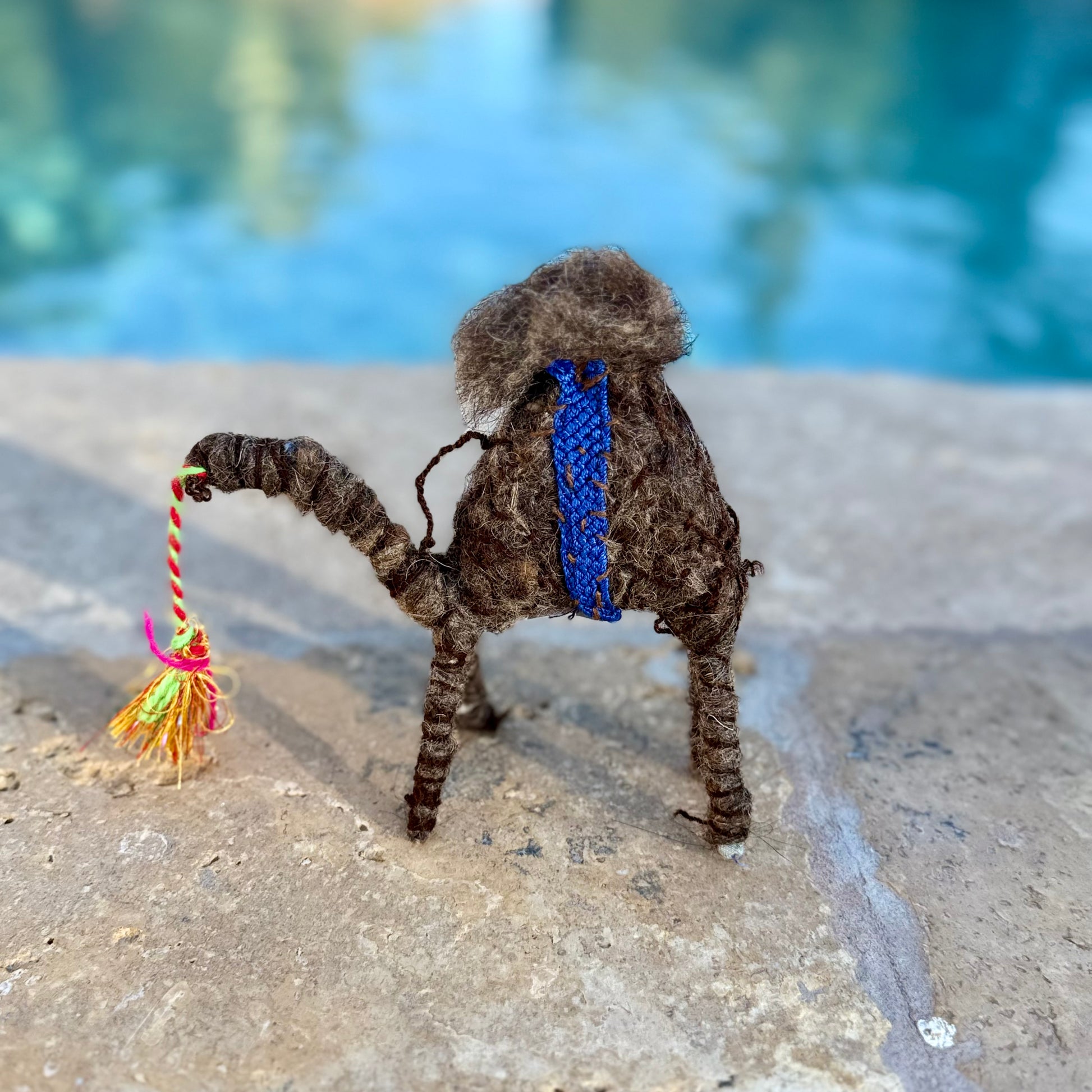 Beldi carries the warm, earthy character of traditional desert craftsmanship, featuring a deep brown wool body, wrapped legs in rich tonal yarns, and a bright woven blue saddle that adds a bold touch of color. His tassel lead, finished in neon yellow, pink, and green, gives him a lively, playful spirit. These camels are more than décor, they are symbols of resilience, artistry, and the beauty of reimagining found materials into something joyful and full of life.