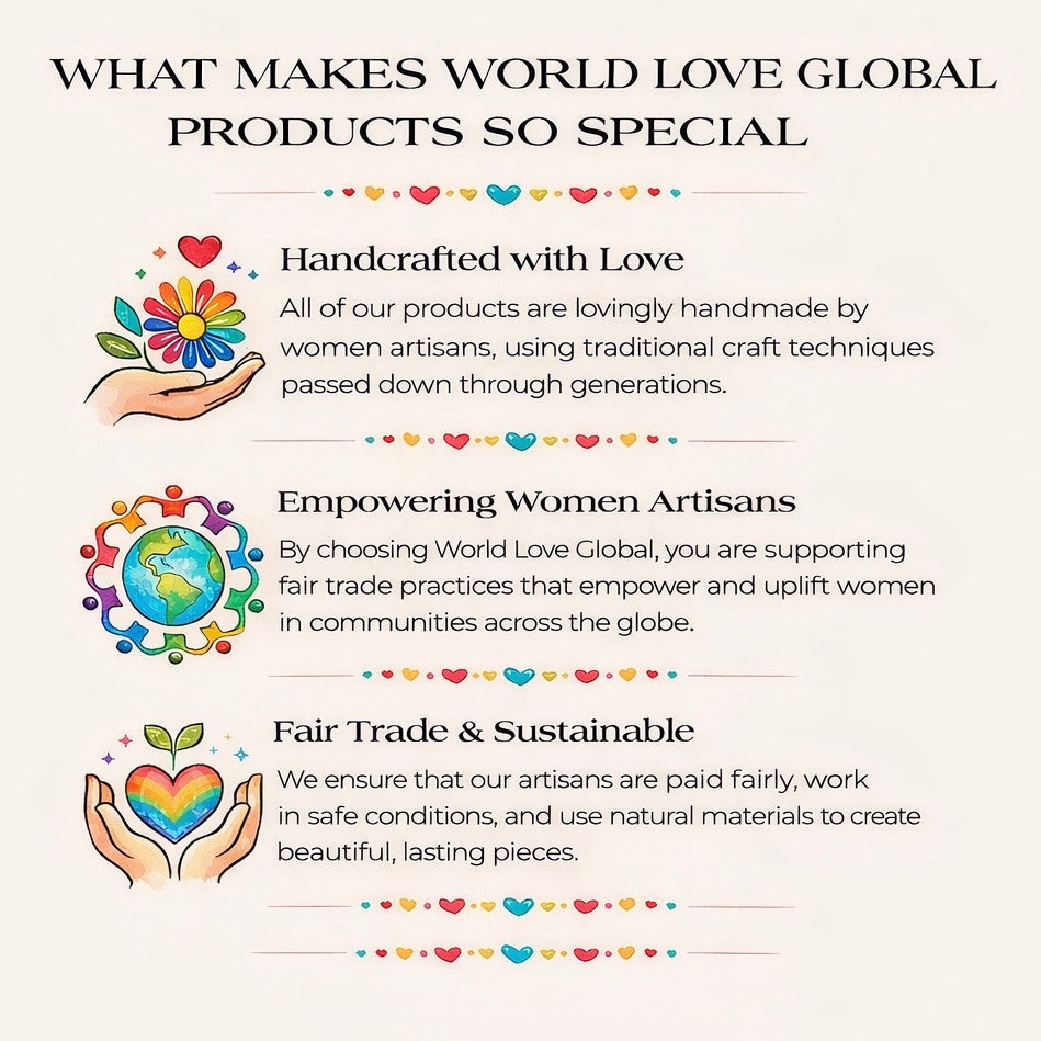 Each purchase supports ethical artisan partnerships and helps preserve traditional craftsmanship through “World Love Global”.