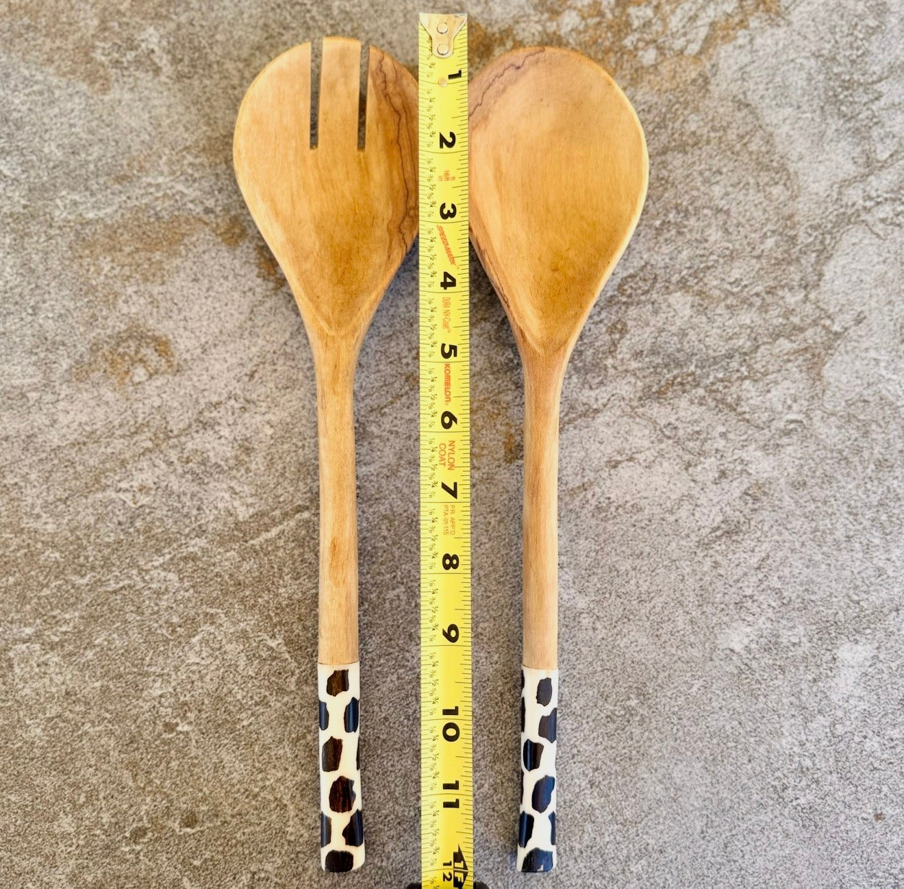 Each piece is crafted by skilled Kenyan artisans from sustainably sourced hardwood, showcasing natural variations in tone and grain that make every set unique. The sculpted heads are smooth and functional for tossing and serving, while the hand-painted handle detail adds character and a subtle modern touch.