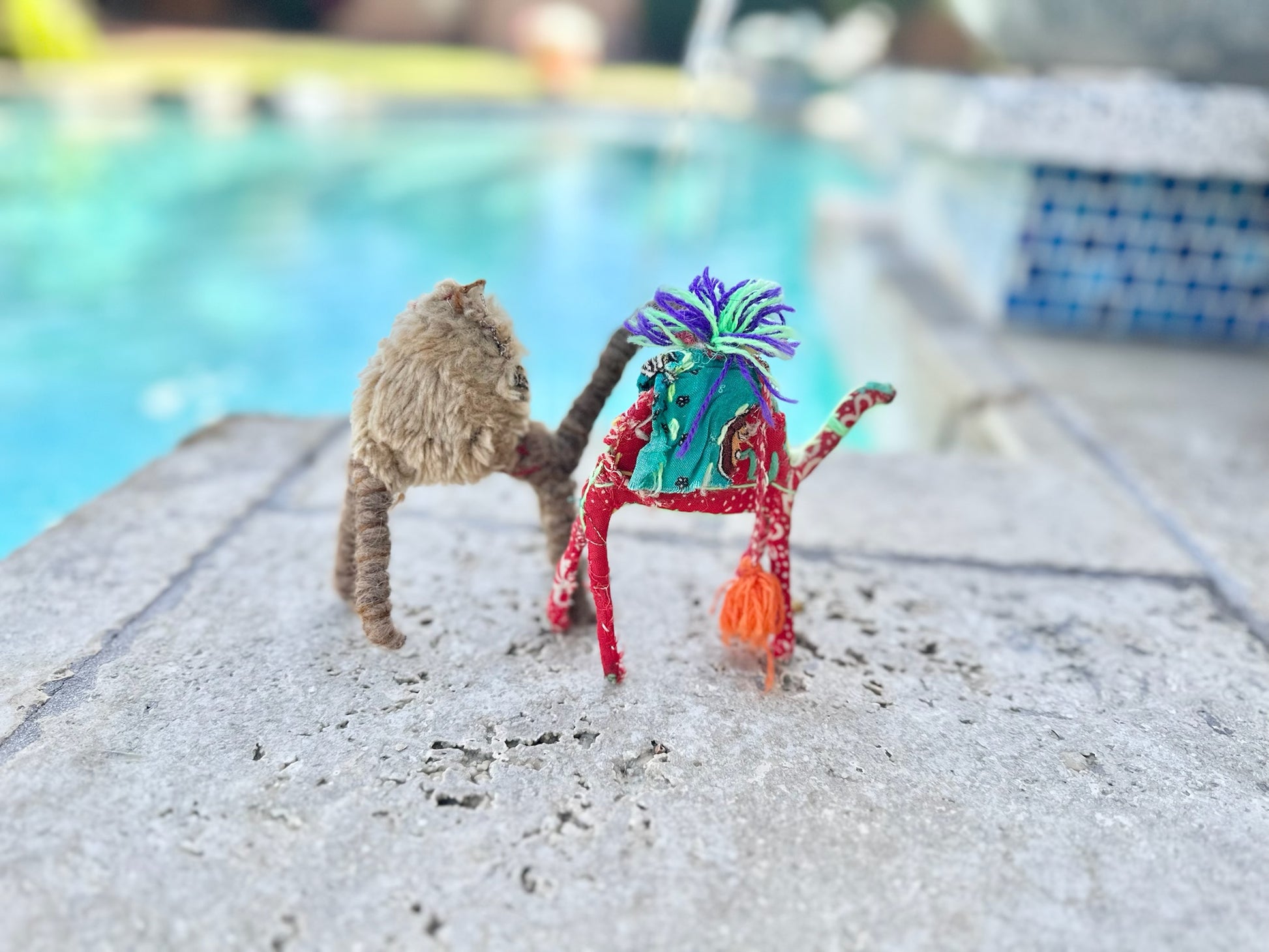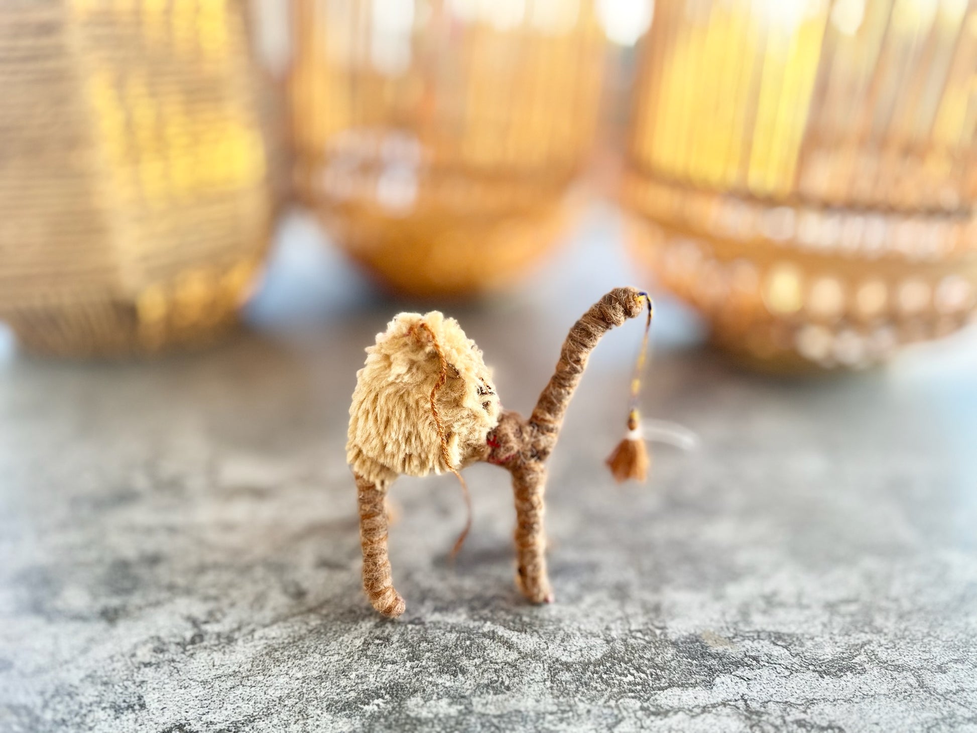 Portia is a camel handmade by the nomadic women of the Sahara desert in Morocco. These amazing women make these camels of items found blowing across the Sahara. Every single camel is unique and has its own personality.