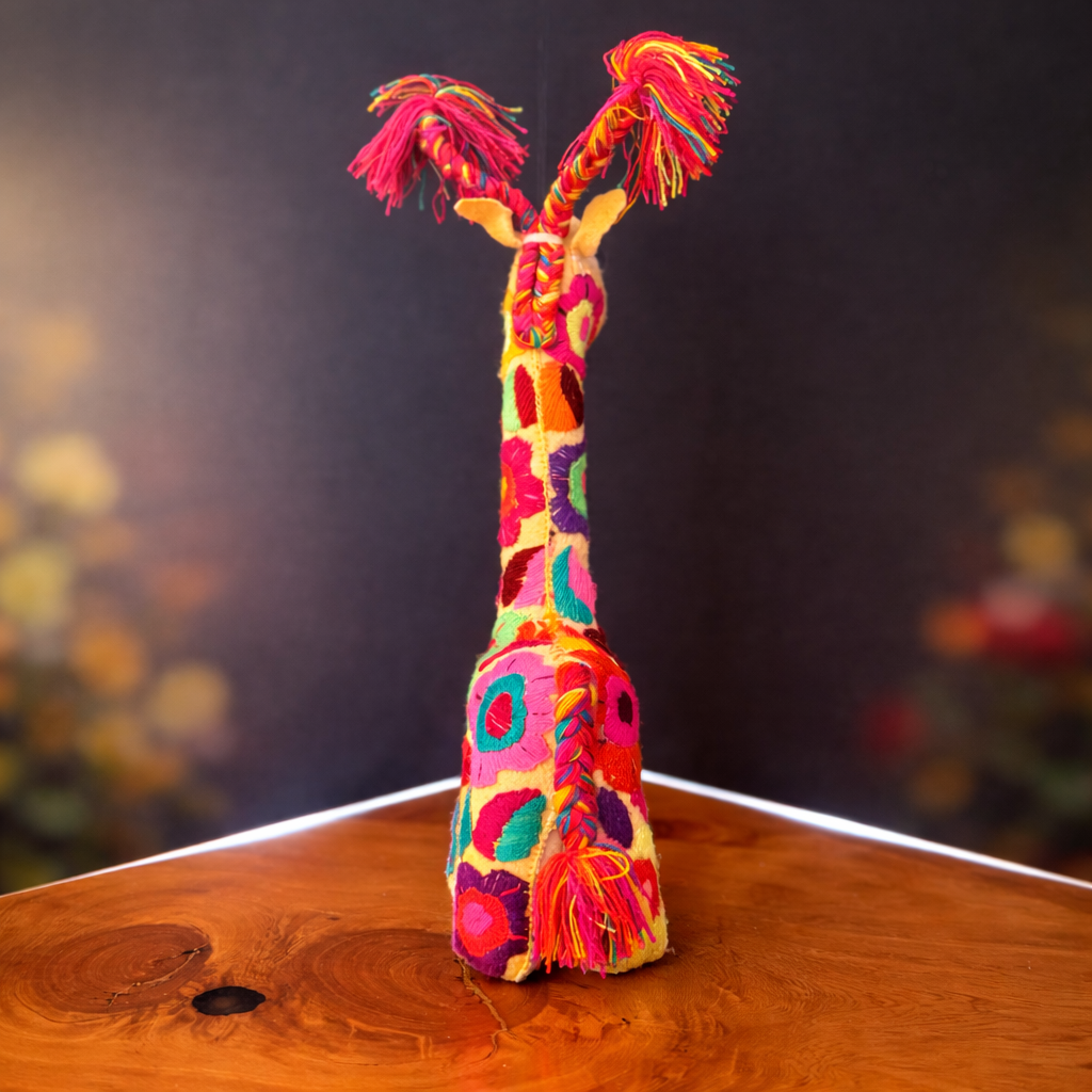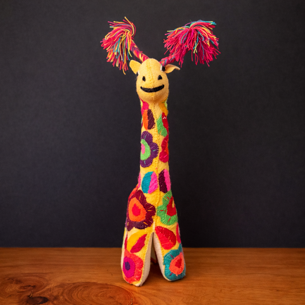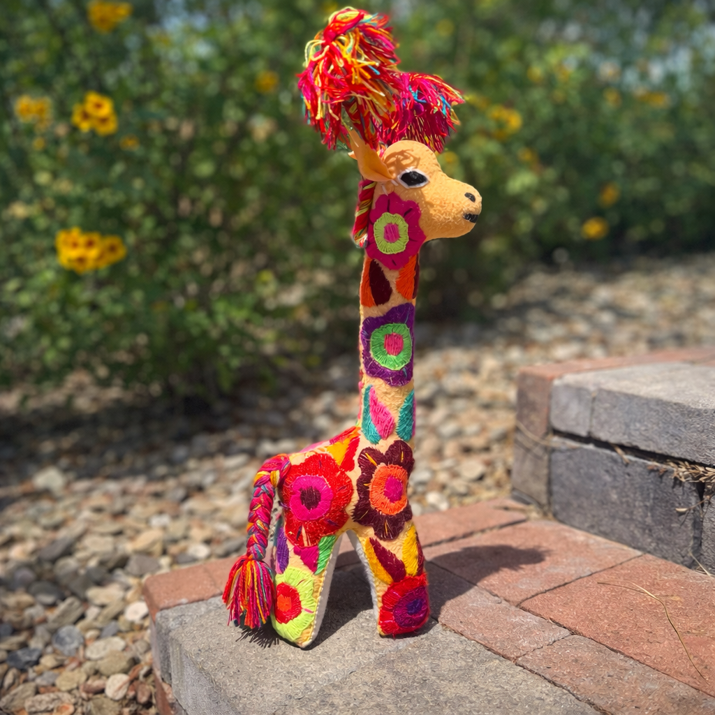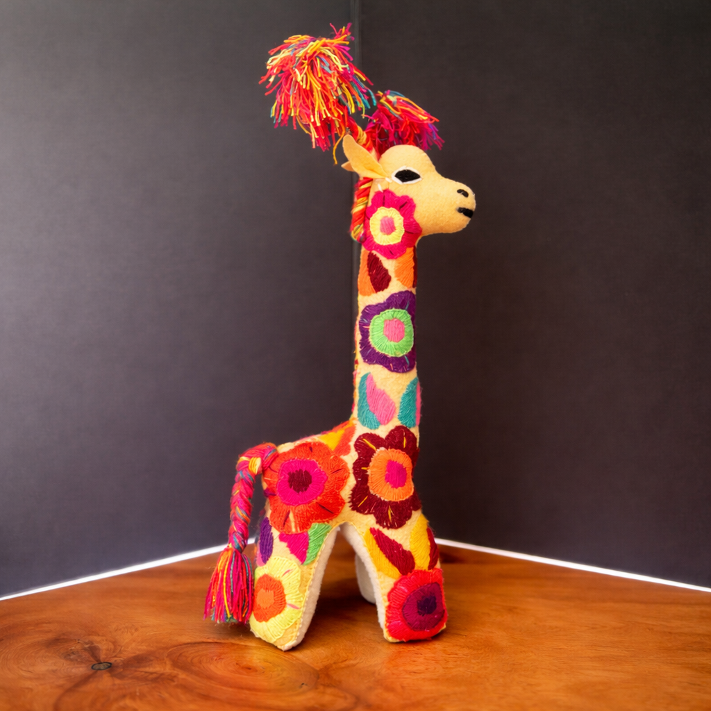 Handcrafted in Chiapas, this joyful giraffe is a celebration of color, culture, and artistry. Each piece is lovingly hand-embroidered using traditional techniques passed down through generations, making every giraffe truly one of a kind.